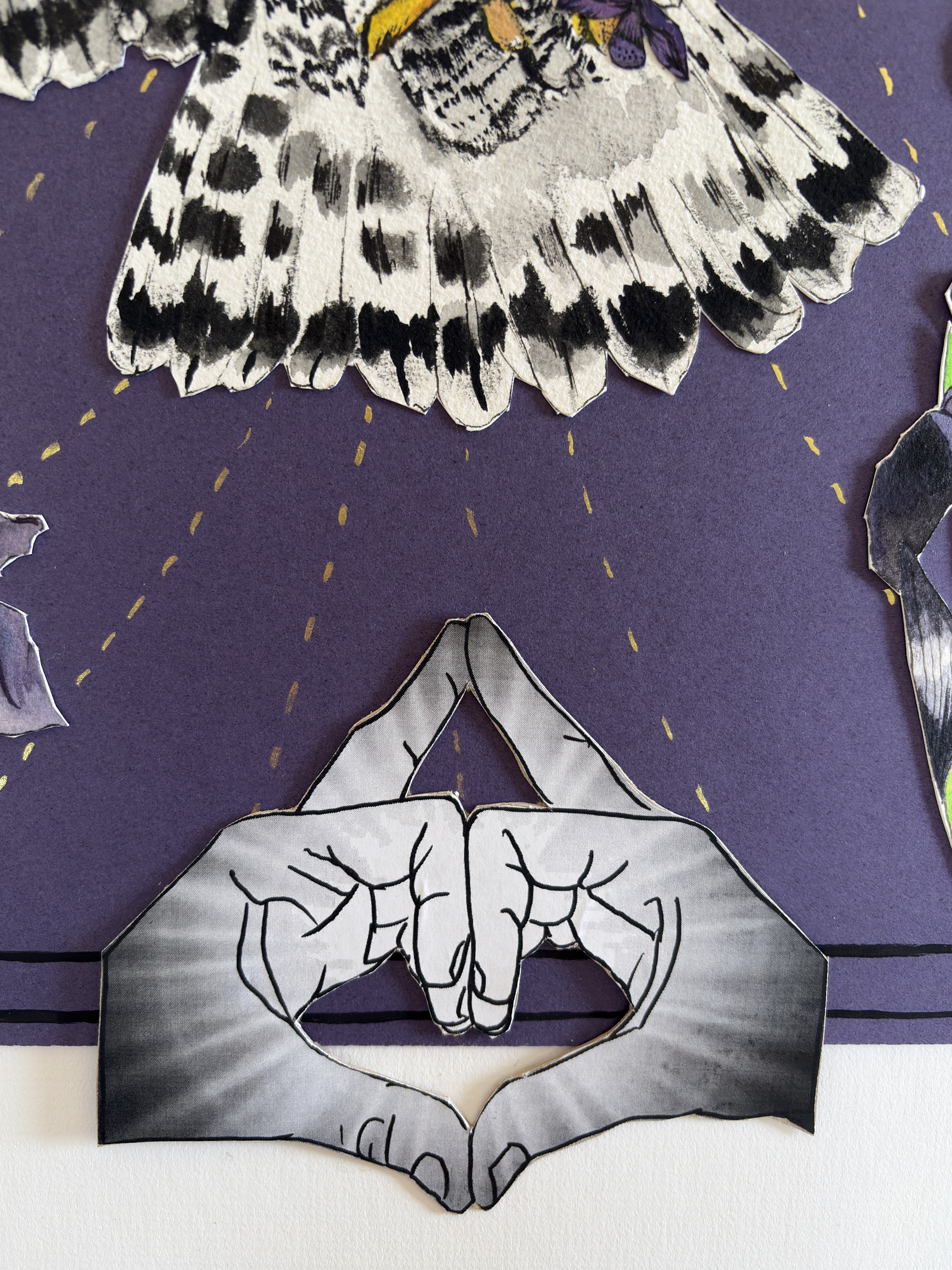 Undoubtedly, creating Ajna has been the most challenging of the series so far. I think it took me about six months to complete. The composition alone was a feat in itself. I did know I wanted a flying animal to embody the idea of wisdom. I remember when I was in Florida,during the winter of 2022/2023, I noticed a red tail hawk sitting on the fence just outside my bedroom window. He sat there staring at me, unmoving, and with his right taloned foot tucked into his torso. I found myself being called to meditate in my corner as he sat out there. I remember a feeling of generosity and feeling honored to be in the presence of such a cunning and calm creature. He may have been a spirit sent to show me something, I cannot know for sure. Regardless, it was a meaningful event in my life.