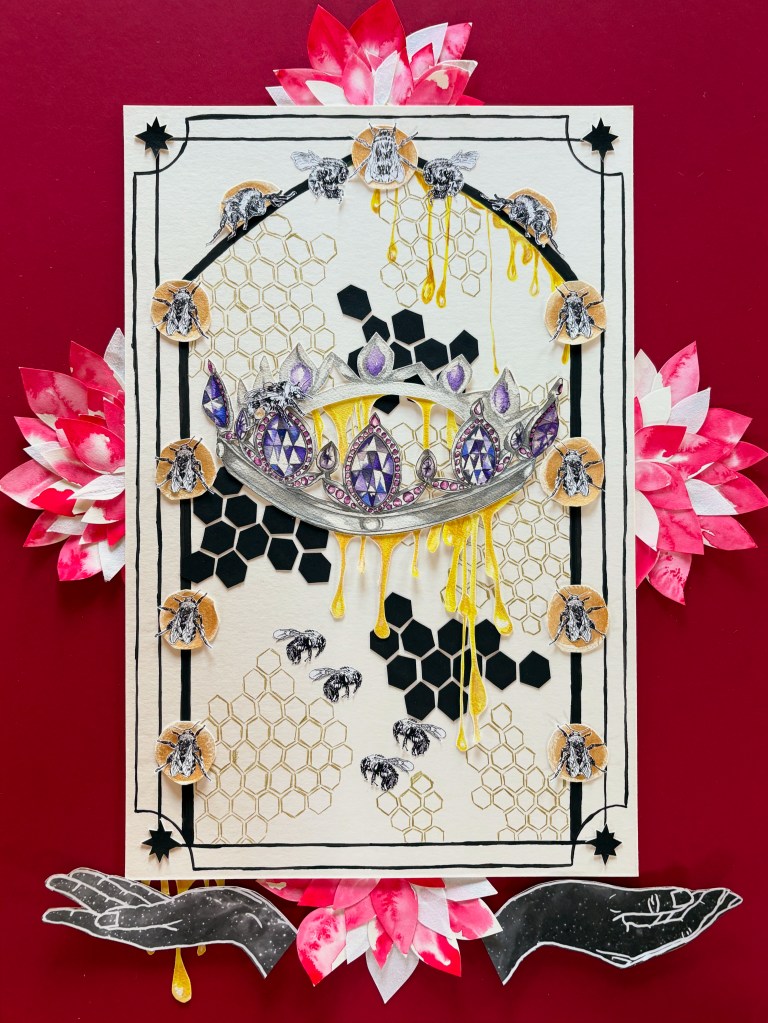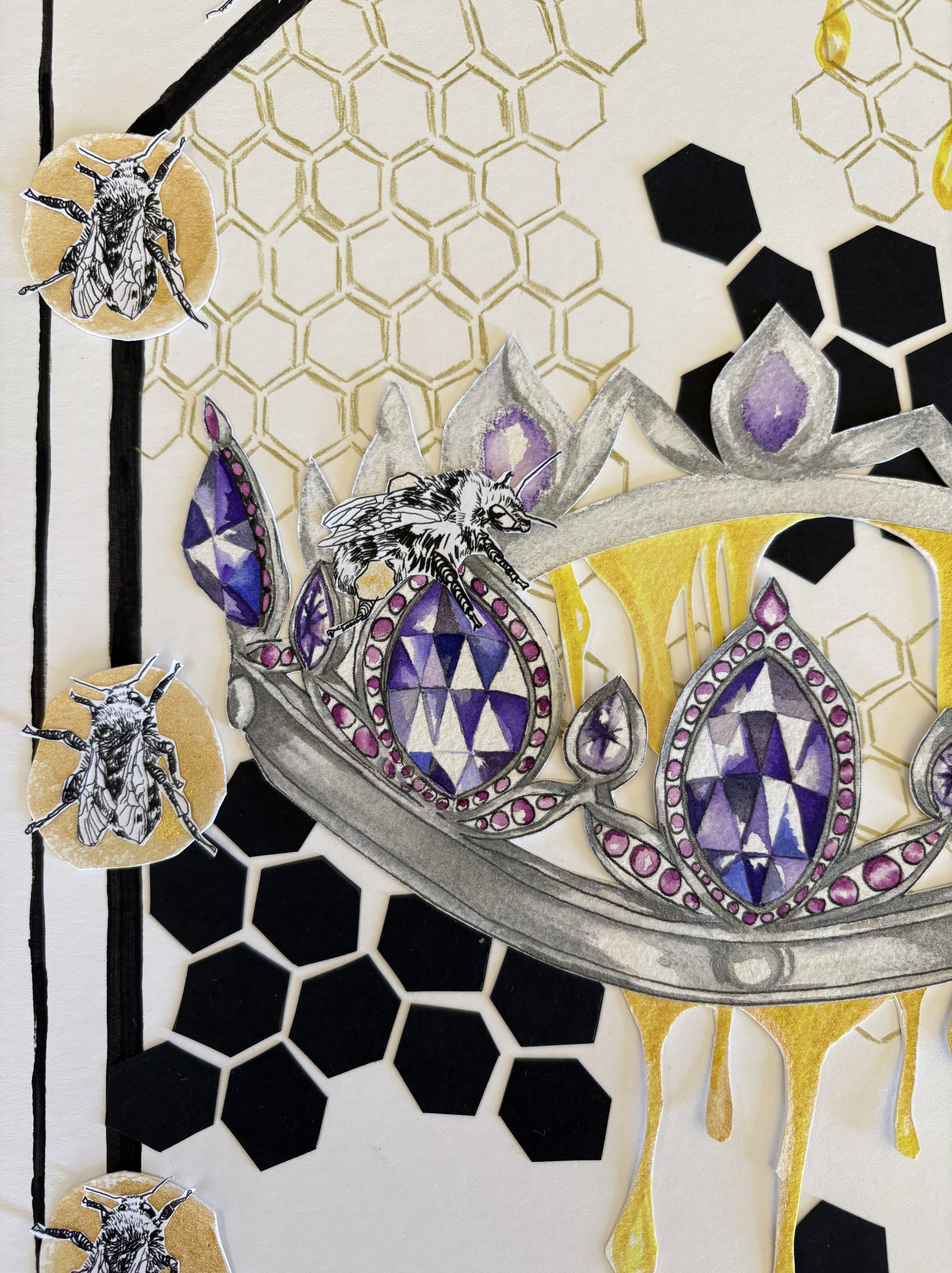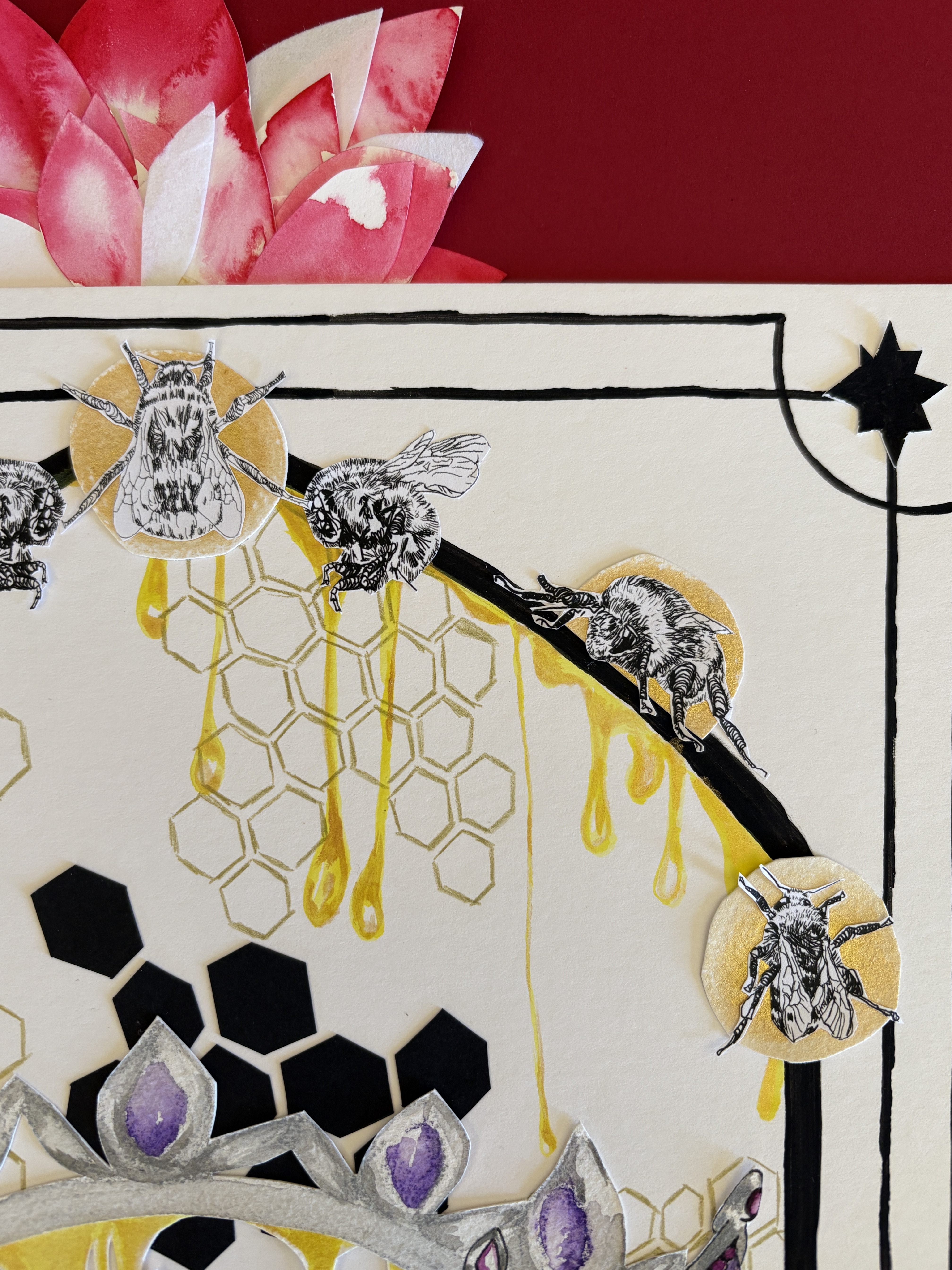 When I began to design the crown chakra, I was lost. I was sure I wanted to paint a jeweled crown. Beyond that was an absolute mystery. I percolated ideas for maybe a year? Leave it to me to always think about the end goal and then struggle to separate the steps to make it there. Sahasrara is the energy that connects us with the unknown, the universe, to infinity and beyond. How could someone possibly create something visually to represent that? A friend of mine suggested the beautiful idea of bees! After some explanation it was decided. Bumble bees, especially, have some pretty seemingly magic powers. Just to name a couple, when flying their wings rotate in a figure eight shape (infinity ya’ll!)They have magnetoreception abilities, they are an active part of their community, and they contribute to the survival of our natural world in a major way. We are lucky to have the gift of bees on this planet. My conception of Sahasrara is intended to be playful with texture, repetition, and symmetry. Black and white communicates concepts of balance, opposition, light and dark, within without, as above so below, etc. Another wise friend of mine told me to look up the deity “Indra” and his jeweled net. What an epic visual to supplement my process! “Indra’s Net is a metaphor originating from Hindu and Buddhist cosmology, representing the interconnectedness of all things. It depicts a vast net, with a jewel at each intersection, where each jewel reflects all other jewels, creating an infinite pattern of reflections. This illustrates the concept that everything in the universe is interrelated and interdependent.” (Wikipedia said it better than I could). I spent extra time and energy on the reflective qualities of the crown in this piece.